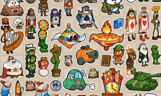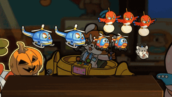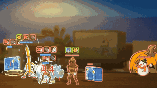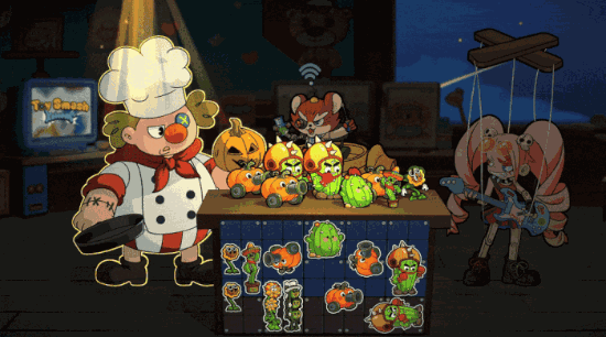 《咔砰!玩具乱斗屋》基于高饱和度、鲜艳的美式卡通画风,打造出充满怀旧的童趣幻想美学。以橡皮管动画风格为灵感,玩具们动作的夸张晃动与变形赋予了动态战斗独特的卡通视觉表现,让人不禁联想到早期迪士尼动画以及知名独立游戏《茶杯头》中的动作美术风格。