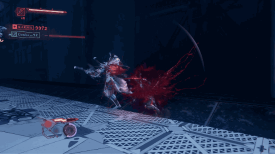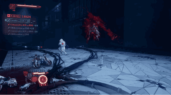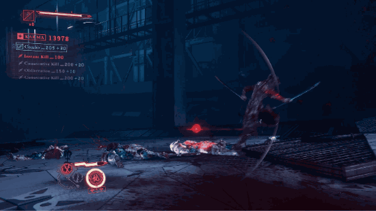 比如,敌人不会再频繁地满地打滚,让你逮住一个杂兵削成人棍不撒手的几率大大增加,而且,我们试玩的关卡中登场的基础杂兵都是纯白色机甲忍者,和八云或者隼龙的一身黑衣对比鲜明,敌我识别十分清晰,也得益于这亮眼的白色盔甲,断肢的敌人身上会有非常显眼的血迹,你一眼扫过人群就知道下一个处决该给谁。