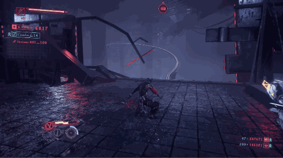 首先,在教学关中很快就会引入的新系统是,按住LT的特殊形态攻击,这也是两个主角最显眼的招式区分,隼龙是各类“闪华”的变种攻击,而八云则是发动“奴延鸟之型”,用鲜血改变武器形态,演化出各种不同的强化攻击。甚至可以做到远程攻击、AOE等夸张的效果,而且无法被敌方招架或防御,也有更高的断肢效率。在“乱杀”槽攒满之后还可以释放清屏秒杀杂兵的绝技,堪比战场压阵的底牌,爽快感拉满。但在此之上,它还有更多的用途。