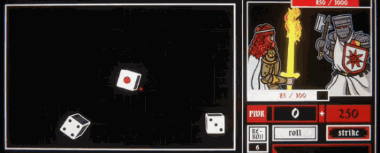 游戏通过玩家骰子投掷出不同的点数,再根据这些点数的组合效果选择是否将其作为能量点数,每次投掷完成后必须选择一个或者一组能够作为武器能量的骰子,然后再利用剩余的骰子选择是否再次投掷,如果再次投掷后的骰子没有获得分数的组合,那玩家之前的所有能量都会被清零。简单的规则让游戏拥有了和小丑牌一样甚至更低的上手门槛,10分钟便能了解游戏的大致规则,加入这场游戏,让骰子的魔法能量注入你的剑刃吧!