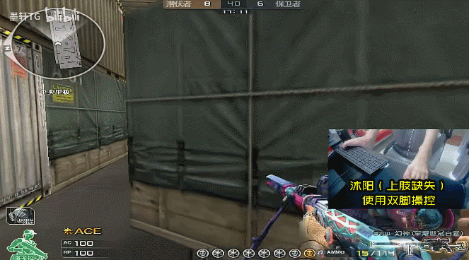 阿铭的脑瘫病症,对于FPS这种高精度定位要求、高反应要求的游戏掌控极难——所以他和另一位脑瘫玩家“安康”在趣味爆破的刀战模式里面,享有了开枪的权利。