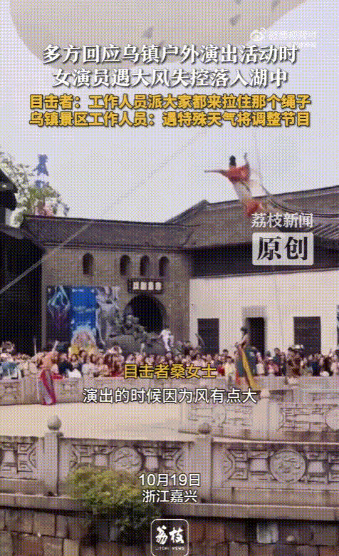 10月20日,据微博@荔枝新闻消息,近日,浙江嘉兴,乌镇景区内女演员演出“扶摇飞天”时出现意外失控,女演员落入湖中。