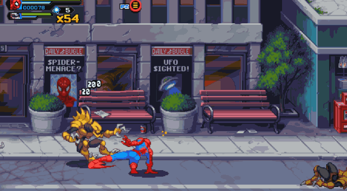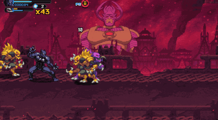 《漫威宇宙入侵》给人的整体质感,与《施莱德的复仇》高度相似:它采用了高分辨率的现代像素风格,动画帧率极度流畅,但又有着类似街机游戏和上世纪卡通片的高饱和度配色方案,给人带来了一种精致的复古感。