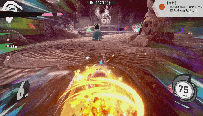 不过,游戏的机制还是很好懂的,想要在对局中获胜,要做的不只有操控飞行器一路通畅行驶,还需要从其他玩家或小怪那里获得能够提供“加速度”的星星。在《驭天飞行者》的赛道上,有各种“星之卡比”系列的小怪杂兵,玩家可以吸取以获得它们的特殊能力,击败敌人时还可获得加速星星。