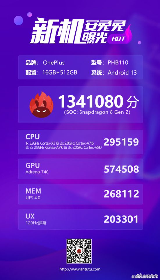 该机跑分成绩为1341080分,其中CPU成绩为295159、GPU部分是574508、MEM部分为268112、UX成绩达203301。在目前已知的骁龙8 Gen 2机型中表现出色。