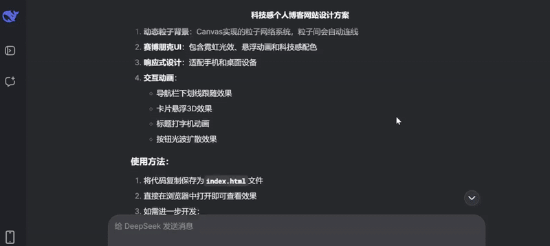新版DeepSeek-V3在2分钟的时间内交付了一个总计400多行代码、设计精良的网站,据其介绍,网站采用了粒子背景动画、赛博朋克UI(霓虹光效、悬浮动画和科技感配色)等设计元素,标题使用打字机动画,按钮具备光波扩散效果。