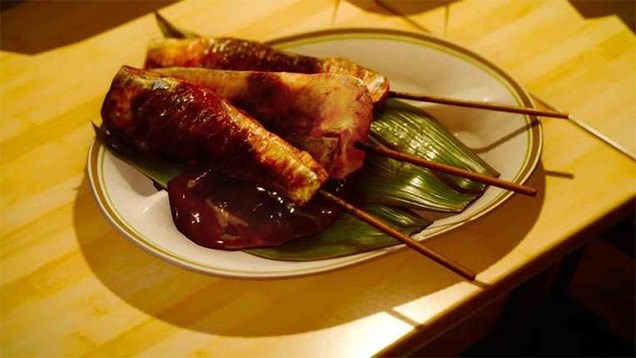 将汁肉鲜美的大马哈鱼切片,用竹签串起,在精心调制的油汁加热烹调,在加入果香的酱汁,香味已经开始弥漫。