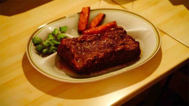 厚切牛排的最理想的样子就是这样,表面微焦,但是当用刀子切开,熟得正好的牛肉香气飘溢开来,口感上既没有生肉的血气,有没有烤焦的糊味,正好。