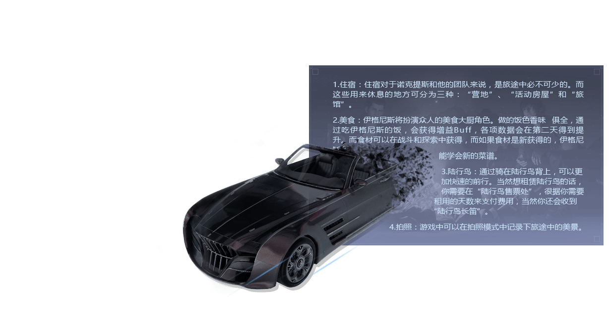 《最终幻想15》是一个相对开放而且丰富多彩的世界,在战斗的闲暇,可以开着车观赏美丽的自然风光,遇到心怡的景色停下来拍照留念。而在城市中,则可以慢慢散步,乘坐载具观光,还可以去探寻饮食店,品尝风土美味。在探索的过程中,会遇到无家可归的小猫、寻求帮助的人,帮助他们解决他们的难题,在支线任务中同样会增长经验提升技能。