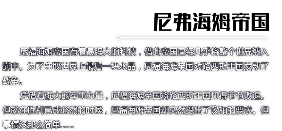 尼福海姆帝国皇帝,为扩大领土而四处侵略他国的霸权主义者。为了夺取世界上仅存的一颗水晶而率军入侵路西斯王国。在路西斯王国节节败退之际,提出了议和的要求。却在议和会议上发动了对路西斯王国的攻击,夺取了水晶。