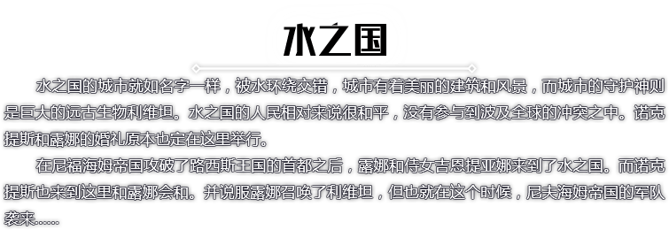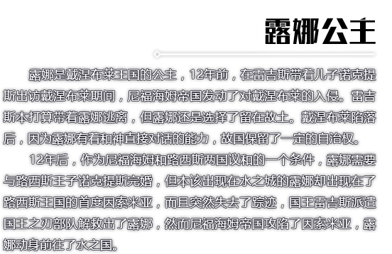 王者之剑的唯一女性成员。作为孤儿长大的经历,使她极为重视和王之剑成员之间的关系,视成员为家人。在与尼福尔海姆帝国签订停战协议前几天,接到任务前往保护露娜公主,但任务期间被人杀害。