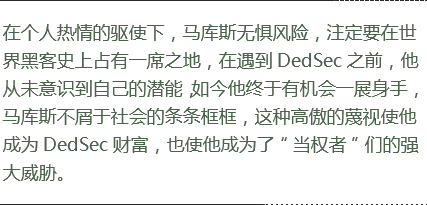 由于Marcus并不是 “正义使者”,所以一代中的随机犯罪追踪任务不会出现,但是会有DedSec组织任务事件触发。