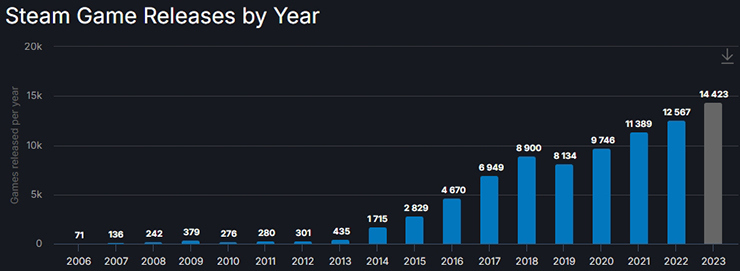 作为全球最重要的PC游戏分发平台,Steam平台2023年仍然保持了往年健康增长的势头,全年共有14423款新游戏在Steam平台上市,同比增长了14.5%;在过去的五年中,每年登陆Steam的新游数量在以年均10.5%的速度稳步增长,其在PC游戏发行市场上的龙头地位仍然在不断巩固。