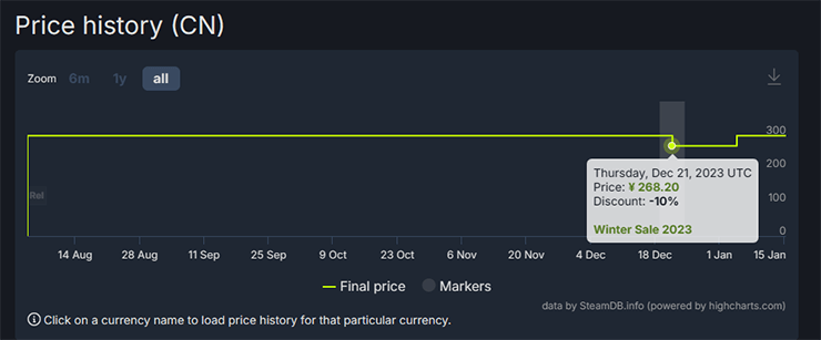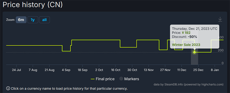6个月内《霍格沃茨之遗》在国区的价格走向,数据来源Steam DB