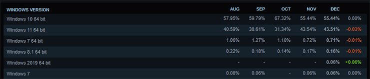 根据Steam硬件统计的2023年12月数据显示,占比最多的操作系统为win10,其次为win11。而在V社提前八个月的政策宣传下,像是win7、win8以及win8.1等Steam不支持的操作系统早在去年八月份就近乎销声匿迹。