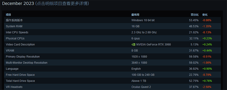 当然,其中还有一些值得关注的数据,例如玩家使用最多的屏幕分辨率是1920×1080;16G的系统内存与大于1TB的硬盘容量已经成为了近半数Steam玩家的标配。