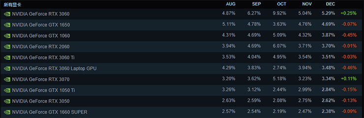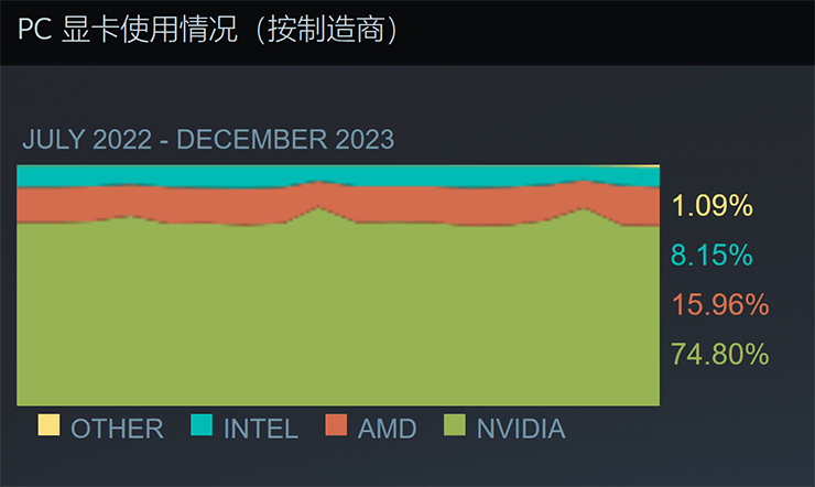 从显卡的种类与使用率来看,N卡仍旧占据了总量的四分之三,而A卡与Intel显卡的使用量则保持了相对的稳定。