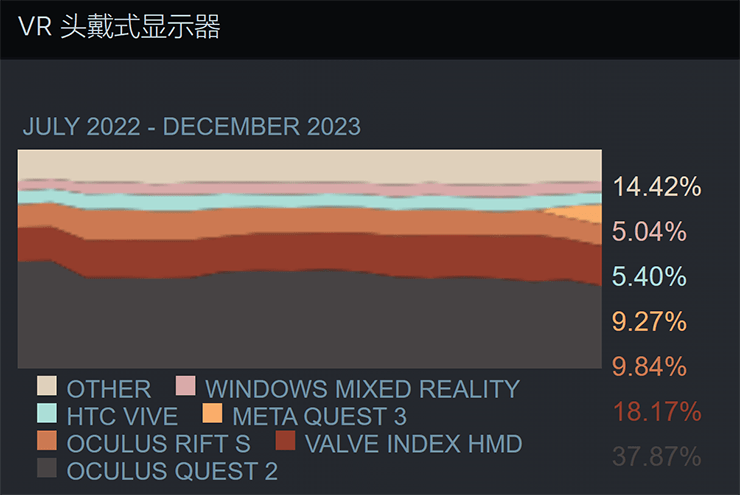 经过了几年的发展后,VR设备的使用率虽然只占到Steam玩家总数的1.84%,但相比于其问世之初的无人问津,如今的局面已经能称得上是稳中向好了。虽然VR玩家数量不多,但我们还是能够看出,Oculus Quest 2的使用率是V社自家Valve Index HMD设备的近两倍。不管怎么说,如何让VR能真正走进大多数玩家的视野,这是件任重而道远的事情。