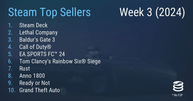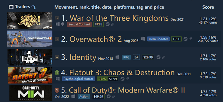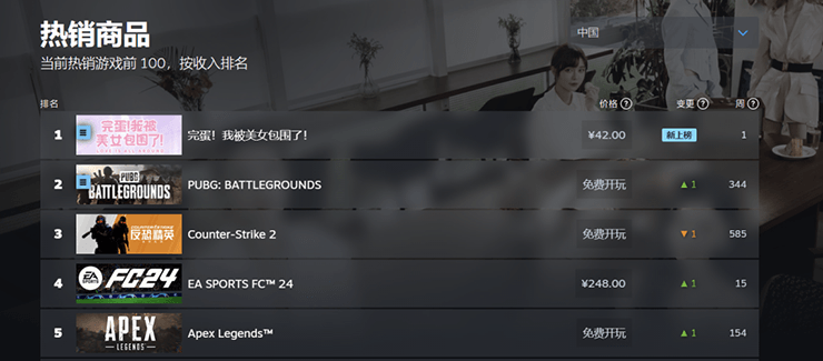 紧随其后的是今年发售的新游,它们在榜单中上游的表现尤为亮眼,《博德之门3》《星空》等话题大作在社区中贡献了持续的流量和热度,这说明在全球范围内,Steam用户对于当年发售的新作有着较强的购买意愿。