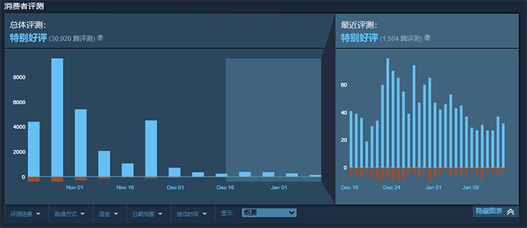在玩家们给出评价的同时,Steam会统计玩家给出“推荐”评价的占比,并以此得出“好评率”,标记在游戏页面的最顶端。同时,系统也会提供近一段时间内评价的好评率,来反映游戏的近期口碑,对于长线运营游戏,或持续推出补丁的游戏来说,这一点格外具有参考意义。