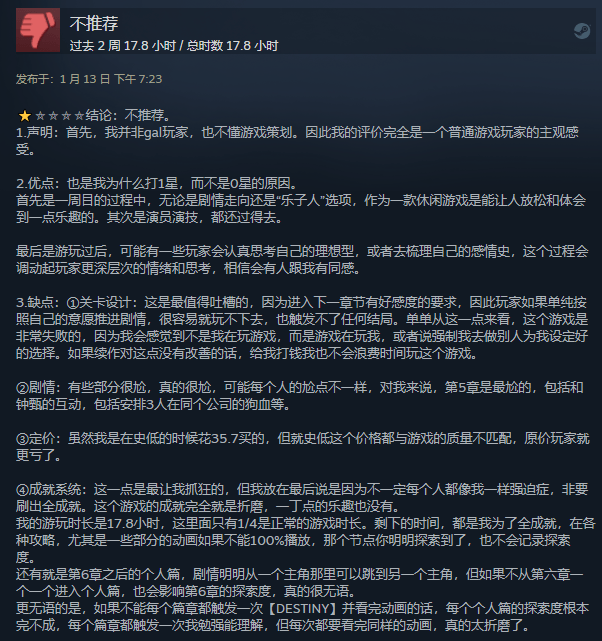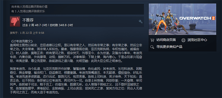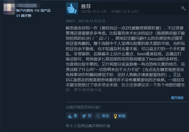 Steam的评价系统,是一个注重文字评论内容的体系。玩家需要给游戏作出推荐或不推荐的整体评价,并附上一段话作为详细的评论内容,后者更能提供具有价值的信息。在评价的标签上,平台会标记该玩家的一些相关信息,诸如该玩家账号内拥有的产品数量、曾经撰写过的评测数量、游玩该游戏的总时长,以及撰写评论时的游戏时长等。