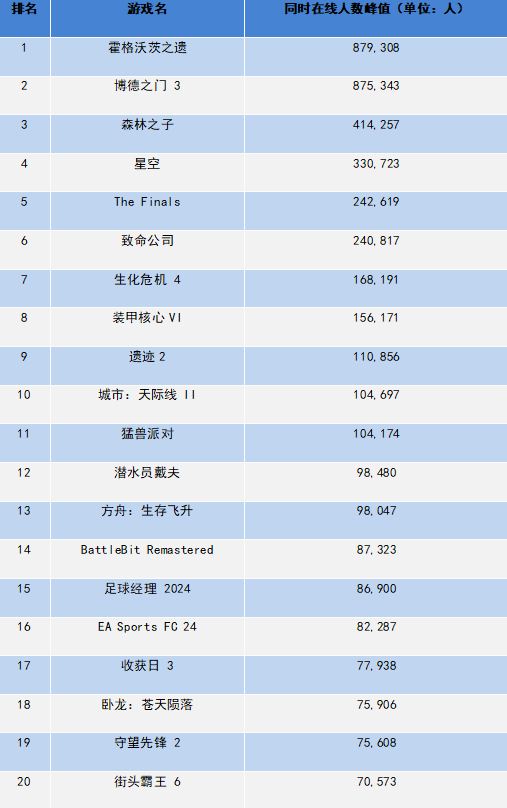 按照Game World Observer的统计,2023年发售的新游中,《霍格沃茨之遗》和《博德之门3》的同时在线人数峰值一骑绝尘,以87万的绝对优势与第三名拉开了断崖式差距。
