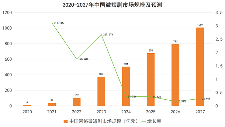 2023年,iiMedia Research(艾媒咨询)数据显示中国微短剧市场规模达374亿元,而到了2027年,这个数字预计会达到1007亿元。