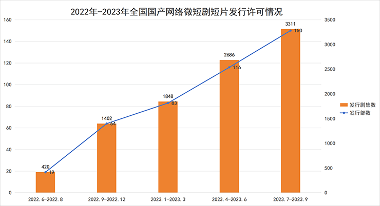 同时,整个2023年短剧的发行数量较之前也有明显提高,仅2023年第三季度,中国网络微短剧正式渠道发行量达150部,接近2022年全年总和的2倍。