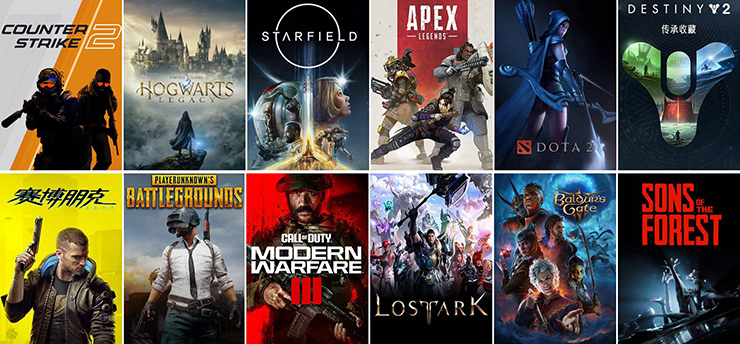 《反恐精英 2(原CS GO)》 《霍格沃茨之遗》 《星空》 《Apex英雄》 《DOTA2》 《命运2》 《赛博朋克2077》 《绝地求生》 《使命召唤20:现代战争3》 《失落的方舟》 《博德之门3》 《森林之子》