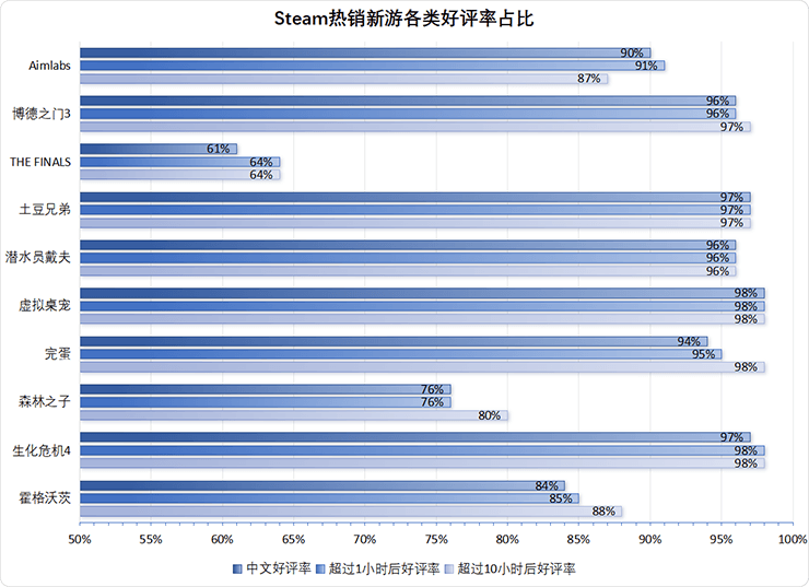 此外,游戏时长与玩家好评之间的相关性也值得关注。还是以这几个在国区讨论度较高的游戏为观察对象,我们统计了中文玩家群体中的好评率、游玩时长为1小时以上的评价好评率,以及10小时以上的好评率。从图表中我们可以看到,整体来说好评会随着游戏时长的增长而产生微量的增加,但从另一个角度来说,这似乎也意味着当玩家决定作出评价的那一刻,似乎整体好评或差评的印象就形成了,体验时间的差异无法产生大的态度转变。在某种程度上,这反映了玩家们对于一款游戏的评价更多地会基于第一印象。