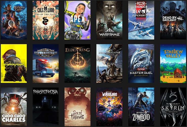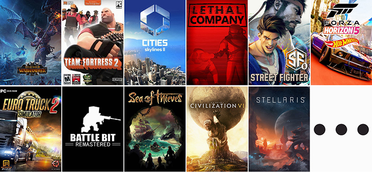 《全面战争:战锤3》 《军团要塞2》 《城市 天际线2》 《致命公司》 《街头霸王6》 《极限竞速:地平线5》 《欧洲卡车模拟器2》 《BattleBit Remastered》 《盗贼之海》 《文明6》 《群星》 《僵尸毁灭工程》 《上古卷轴 OL》 《NBA 2K23》 《雀魂》 《方舟:生存飞升》 《遗迹2》 《星球大战 绝地:幸存者》 《猛兽派对》 《死亡空间》 《Rust》 《新世界》 《模拟人生4》