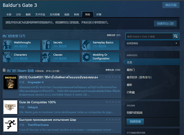 还是以上面提到的多个游戏为例,让我们来关注一下它们在社区中的表现。《博德之门3》是一个典型的活跃社区。在这里,有超过70000个讨论帖,且有着良好的话题分类,讨论涵盖多种语言;创作板块每周都在更新的高质量玩家画作,指南区有超过1300篇指南,其中的366篇为相对耗费精力的流程攻略向指南,且在所有类型中占比最大。
