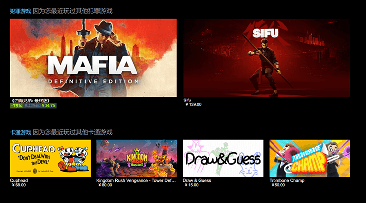和短视频平台的推荐算法类似,Steam推荐也是一个基于用户兴趣选择推送对象的机制,这让Steam成为一个可以“逛”的游戏超市。不过,在诸多游戏平台中,Steam的推荐算法尤其激进,这是一个将游戏极端细分,并严格面向玩家兴趣的推荐机制,也是Steam引以为傲的“平台特色”。