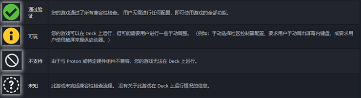 SteamDeck虽然被称为“PC掌机”,但毕竟它有着自己独特的硬件架构,若要发挥出Steam庞大游戏库的优势,那兼容和适配问题必然是重中之重。而为了让更多游戏适配Steam Deck,也让玩家和厂商更容易理解每个游戏的兼容程度,V社根据各个游戏的适配和优化程度专门推出了一个兼容性适配分级,这个机制将Steam库中的游戏分为四类:通过验证、可玩、不受支持与未知。