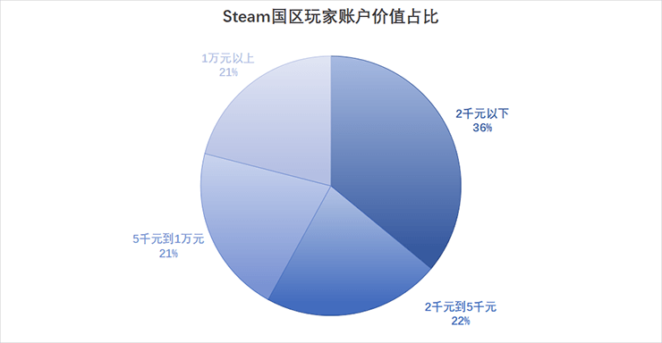 而在账户的价值上,处在5千元人民币及以下的玩家群体占了整个Steam国区玩家的近60%,其中账户价值小于等于2千元人民币的玩家数量约为36%,在2千元人民币到5千元人民币这个区间的玩家数量则约为22%。而账户价值在5千到1万元人民币的玩家数量则与大于1万元人民币的旗鼓相当,均约为21%。换句话说,尽管有不少人都在调侃“用Steam账户换套房”,但对大多数的国区玩家来说,这句话终究还只是个玩笑罢了。