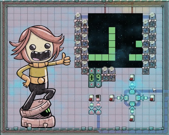 游戏后期还能实现完全的机械自动化,这项玩法非常考验玩家的逻辑能力,你要捋清楚各种“是是非非”的关系,让设施总能在你想要的时刻运作,而在其他时间关停减少人力付出及资源消耗。比如将智能电池与发电机相连,并给电池设置一个充电阈值,发电机就只会在电量低于阈值时进行工作。当然,得益于《缺氧》的高自由度,各路大佬也玩出了不少花样,比如像下面这些: